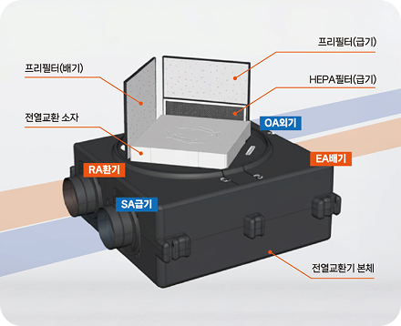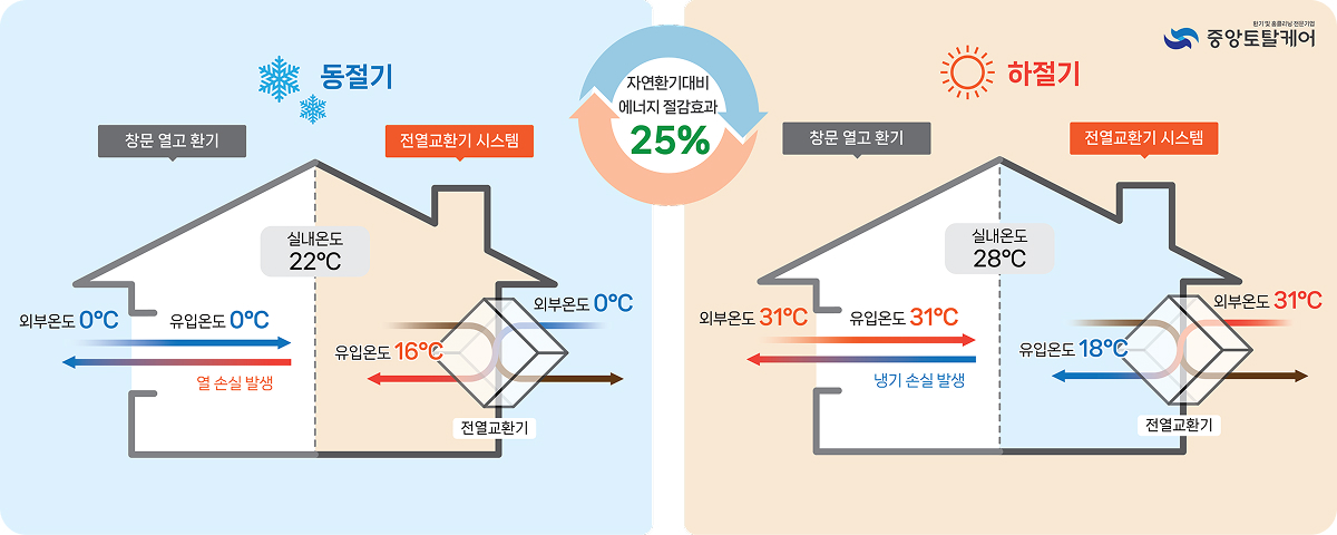 실내 공기의 열을 이용해 외부 공기를 적절한 온도로 조절하여 여름에는 실내 냉방 공기의 냉기를 외부 공기에 전 달하여 시원하게 들여오고, 겨울에는 실내 난방 공기의 열기를 외부 공기에 전달하여 따뜻하게 들여옴으로써 냉난방 비용을 절감합니다.